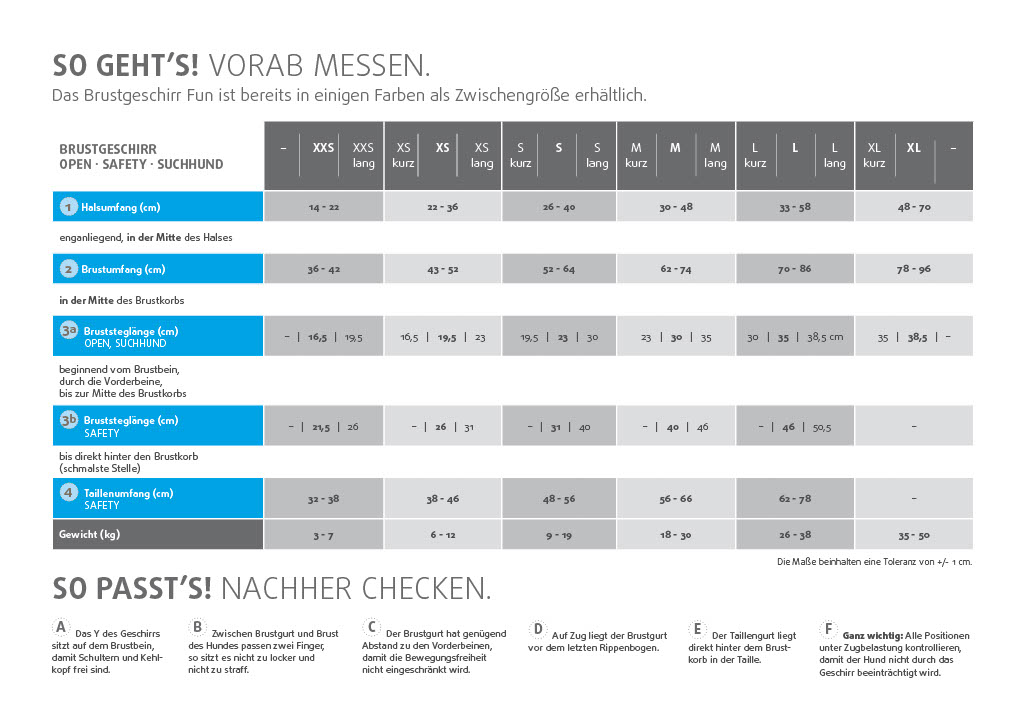 Das gepolsterte (vollunterlegte) Geschirr Fun ist im Hals- und Brustbereich individuell einstellbar und zwei bis zu 70kg Zugbelastung ausgerichtete Steckschnallen (ab Gr. M) sorgen für einen bequemen Einstieg. Das Geschirr ist so aufgebaut, dass es sich dem Körperbau des Hundes ergonomisch anpasst, dadurch entsteht eine optimale Zugverteilung, die den Rücken Ihres Hundes schont. Die umlaufenden Gurte im Brustbereich bilden dank des langen Unterbruststegs einen bewegungsfreundlichen Abstand zu den Vorderbeinen, so dass die Achseln geschont werden.